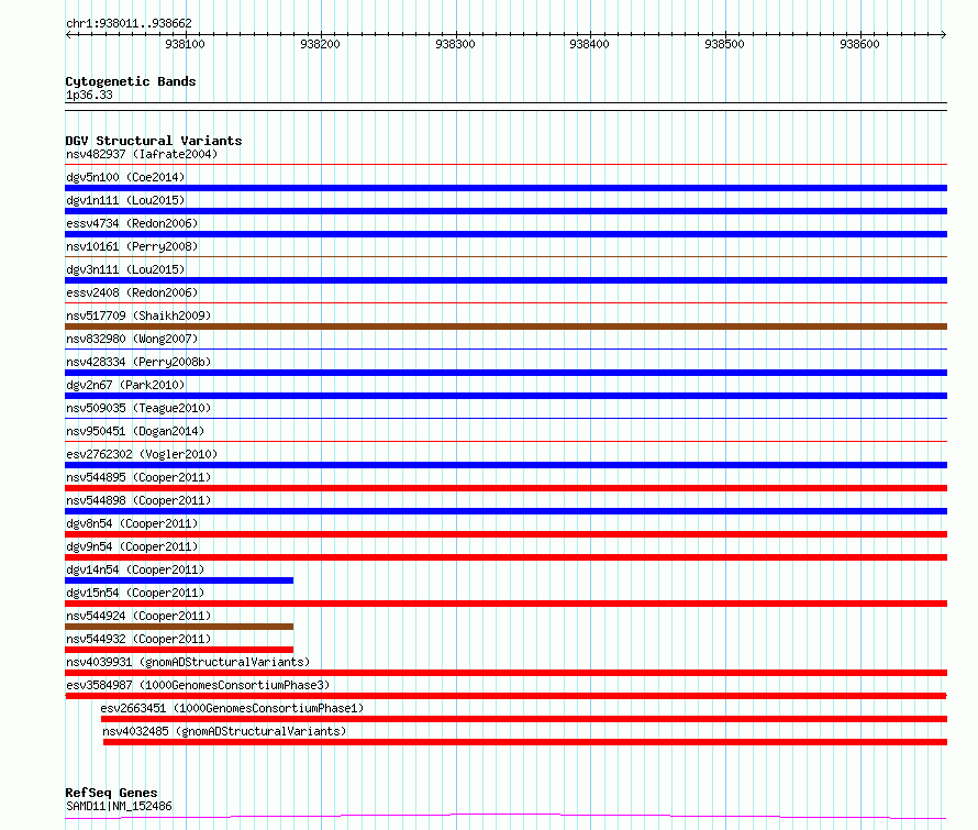 Variant DetailsVariant: esv3584987| Internal ID | 6625306 | | Landmark | | | Location Information | | | Cytoband | 1p36.33 | | Allele length | | Assembly | Allele length | | hg38 | 652 | | hg19 | 652 |