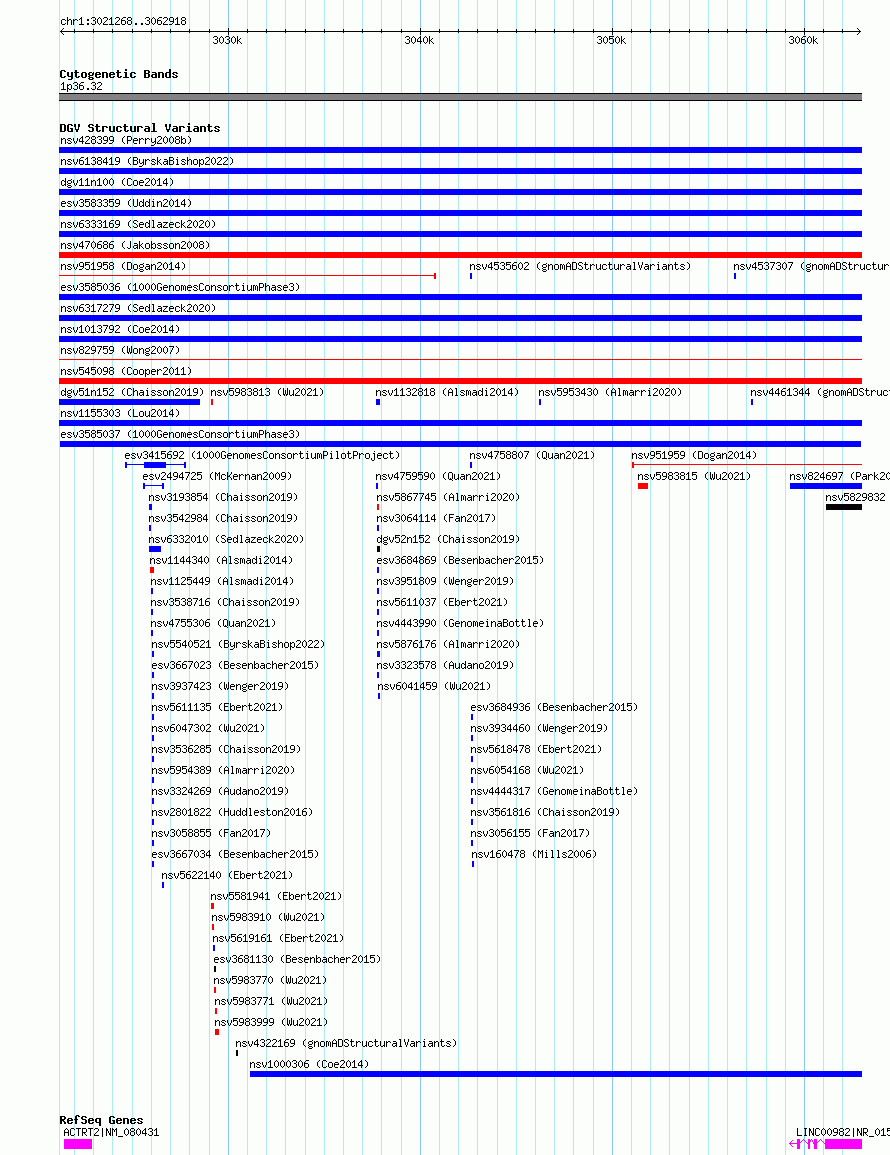 Variant DetailsVariant: esv3585037| Internal ID | 6972561 | | Landmark | | | Location Information | | | Cytoband | 1p36.32 | | Allele length | | Assembly | Allele length | | hg38 | 41651 | | hg19 | 41651 |