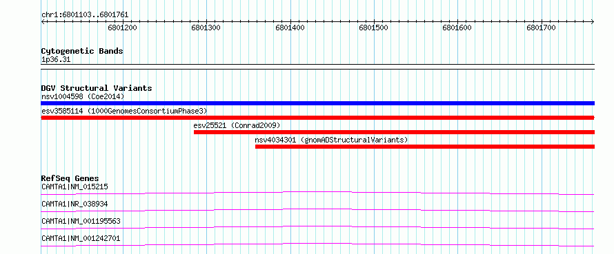 | | Variant Type | CNV loss | | Copy Number | | | Allele State | | | Allele Origin | | | Probe Count | | | Validation Flag | | | Merged Status | M | | Merged Variants | | | Supporting Variants | essv9846131, essv9846130 | | Samples | NA19916, NA18909 | | Known Genes | CAMTA1 | | Method | Sequencing | | Analysis | | | Platform | Multiple platforms | | Comments | | | Reference | 1000_Genomes_Consortium_Phase_3 | | Pubmed ID | 21293372 | | Accession Number(s) | esv3585114