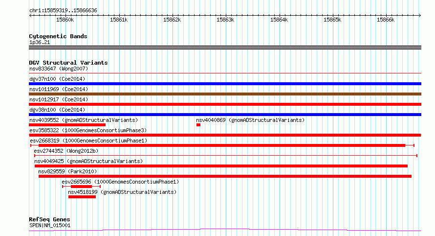 | Variant Type | CNV loss | Copy Number | | Allele State | | Allele Origin | | Probe Count | | Validation Flag | | Merged Status | M | Merged Variants | | Supporting Variants | essv9864700, essv9864704, essv9864701, essv9864698, essv9864705, essv9864702, essv9864699, essv9864703 | Samples | NA18641, HG00654, HG00674, NA18537, NA18531, HG01028, HG02410, NA18552 | Known Genes | SPEN | Method | Sequencing | Analysis | | Platform | Multiple platforms | Comments | | Reference | 1000_Genomes_Consortium_Phase_3 | Pubmed ID | 21293372 | Accession Number(s) | esv3585322