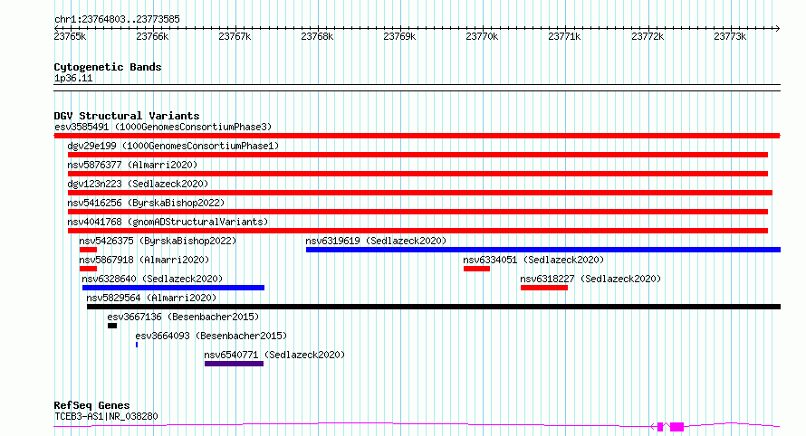 Variant DetailsVariant: esv3585491 | Internal ID | 6973014 | | Landmark | | | Location Information | | | Cytoband | 1p36.11 | | Allele length | | Assembly | Allele length | | hg38 | 8783 | | hg19 | 8783 |