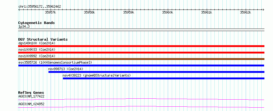 | Variant Type | CNV gain | Copy Number | | Allele State | | Allele Origin | | Probe Count | | Validation Flag | | Merged Status | M | Merged Variants | | Supporting Variants | essv9901864, essv9901860, essv9901866, essv9901854, essv9901858, essv9901852, essv9901853, essv9901849, essv9901855, essv9901867, essv9901861, essv9901868, essv9901848, essv9901851, essv9901859, essv9901869, essv9901857, essv9901863, essv9901862, essv9901870, essv9901850, essv9901856, essv9901865 | Samples | HG03121, NA19332, HG03518, HG03297, NA18616, NA19457, NA20287, NA19038, NA19471, HG02545, NA19451, NA19391, NA18516, HG02283, NA19320, NA19395, NA19375, NA19309, HG01551, NA19376, HG03313, NA19346, NA19431 | Known Genes | AGO3 | Method | Sequencing | Analysis | | Platform | Multiple platforms | Comments | | Reference | 1000_Genomes_Consortium_Phase_3 | Pubmed ID | 21293372 | Accession Number(s) | esv3585726
