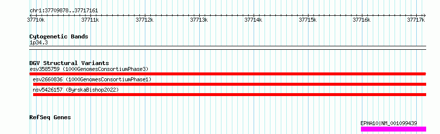 | | Variant Type | CNV loss | | Copy Number | | | Allele State | | | Allele Origin | | | Probe Count | | | Validation Flag | | | Merged Status | M | | Merged Variants | | | Supporting Variants | essv9912708, essv9912709 | | Samples | NA19314, NA19404 | | Known Genes | EPHA10 | | Method | Sequencing | | Analysis | | | Platform | Multiple platforms | | Comments | | | Reference | 1000_Genomes_Consortium_Phase_3 | | Pubmed ID | 21293372 | | Accession Number(s) | esv3585759
