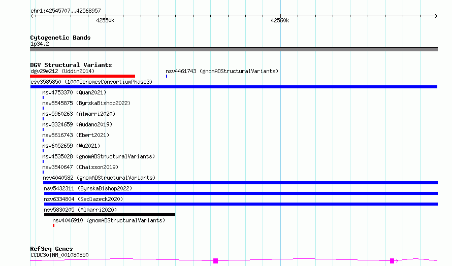 Variant DetailsVariant: esv3585850| Internal ID | 6973370 | | Landmark | | | Location Information | | | Cytoband | 1p34.2 | | Allele length | | Assembly | Allele length | | hg38 | 23251 | | hg19 | 23251 |