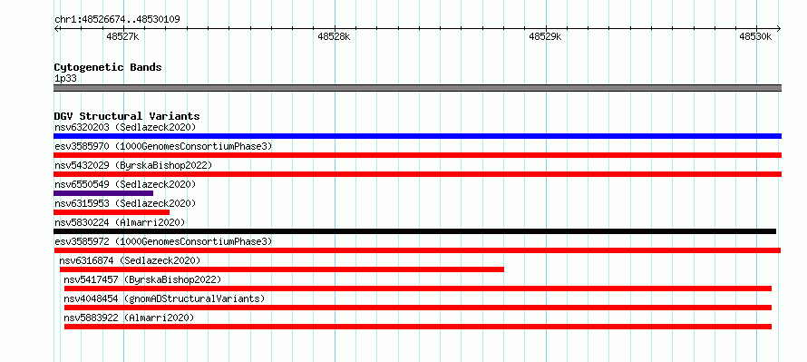 Variant DetailsVariant: esv3585972| Internal ID | 6973491 | | Landmark | | | Location Information | | | Cytoband | 1p33 | | Allele length | | Assembly | Allele length | | hg38 | 3436 | | hg19 | 3436 |