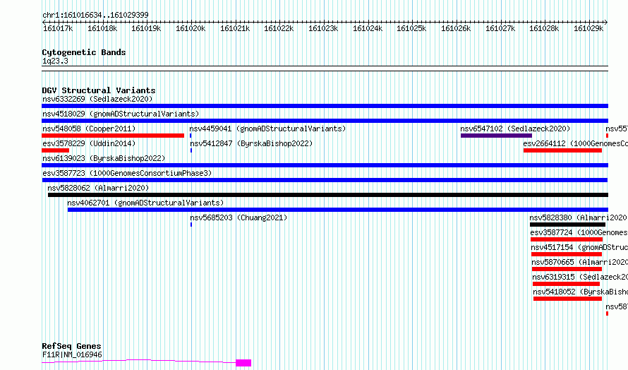 Variant DetailsVariant: esv3587723| Internal ID | 6975146 | | Landmark | | | Location Information | | | Cytoband | 1q23.3 | | Allele length | | Assembly | Allele length | | hg38 | 12766 | | hg19 | 12766 |