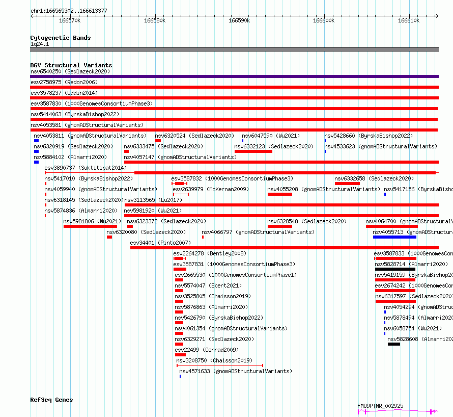 Variant DetailsVariant: esv3587830| Internal ID | 6975254 | | Landmark | | | Location Information | | | Cytoband | 1q24.1 | | Allele length | | Assembly | Allele length | | hg38 | 48076 | | hg19 | 48076 |