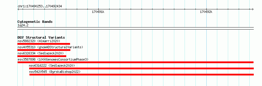 Variant DetailsVariant: esv3587898| Internal ID | 6975321 | | Landmark | | | Location Information | | | Cytoband | 1q24.2 | | Allele length | | Assembly | Allele length | | hg38 | 2182 | | hg19 | 2182 |