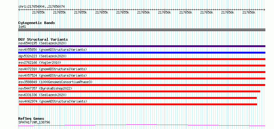 Variant DetailsVariant: esv3588849| Internal ID | 6976265 | | Landmark | | | Location Information | | | Cytoband | 1q41 | | Allele length | | Assembly | Allele length | | hg38 | 1171 | | hg19 | 1171 |