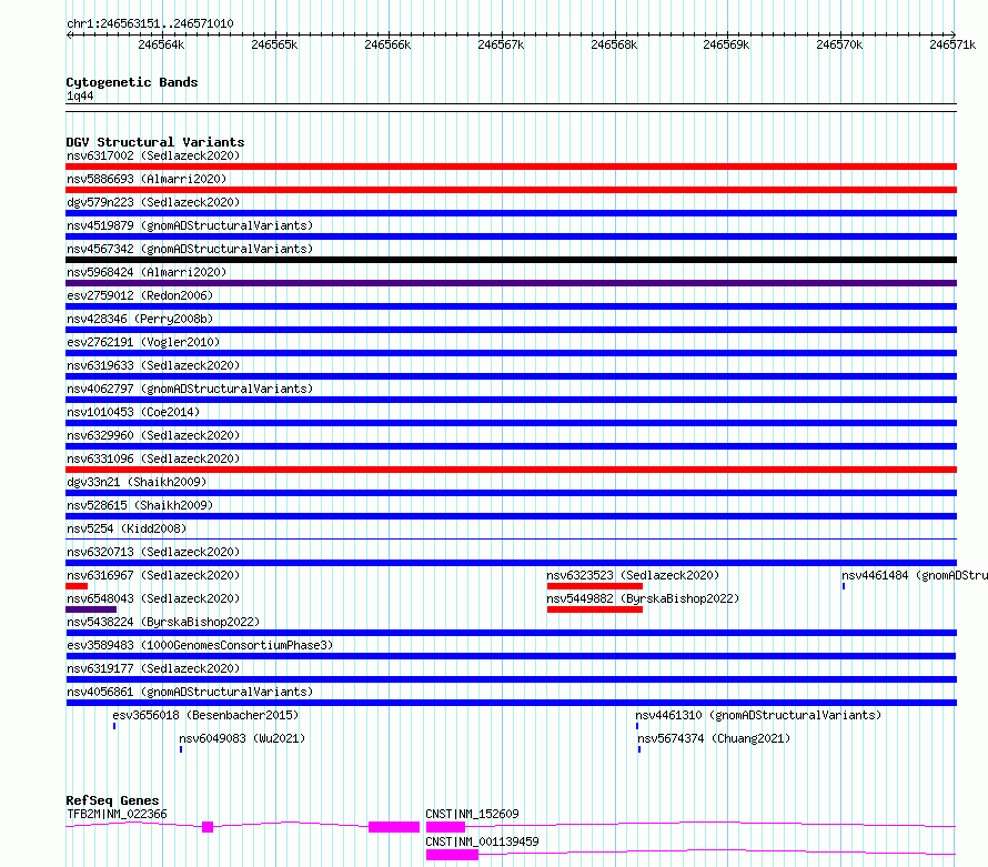 Variant DetailsVariant: esv3589483| Internal ID | 6976811 | | Landmark | | | Location Information | | | Cytoband | 1q44 | | Allele length | | Assembly | Allele length | | hg38 | 7860 | | hg19 | 7860 |