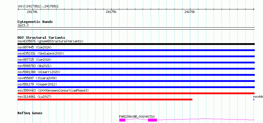 Variant DetailsVariant: esv3590063| Internal ID | 6977391 | | Landmark | | | Location Information | | | Cytoband | 2p23.3 | | Allele length | | Assembly | Allele length | | hg38 | 3000 | | hg19 | 3000 |