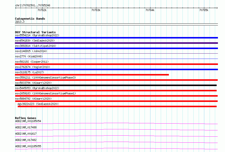 | | Variant Type | CNV loss | | Copy Number | | | Allele State | | | Allele Origin | | | Probe Count | | | Validation Flag | | | Merged Status | M | | Merged Variants | | | Supporting Variants | essv10537790, essv10537805, essv10537792, essv10537774, essv10537788, essv10537773, essv10537802, essv10537798, essv10537777, essv10537787, essv10537799, essv10537801, essv10537786, essv10537780, essv10537778, essv10537779, essv10537791, essv10537797, essv10537796, essv10537784, essv10537782, essv10537803, essv10537794, essv10537776, essv10537783, essv10537781, essv10537804, essv10537800, essv10537793, essv10537789, essv10537785, essv10537775, essv10537795, essv10537806 | | Samples | HG03514, HG03280, HG03172, HG02895, HG03436, NA18923, HG03224, NA20287, HG02111, HG01242, NA18868, NA20340, HG02545, HG03267, HG02943, NA19908, HG03132, NA19391, NA19043, NA19118, NA19031, NA19160, NA19095, NA19035, NA19375, HG03367, NA20276, HG01958, HG03313, NA19185, NA19102, NA19116, HG01914, HG03166 | | Known Genes | ADD2 | | Method | Sequencing | | Analysis | | | Platform | Multiple platforms | | Comments | | | Reference | 1000_Genomes_Consortium_Phase_3 | | Pubmed ID | 21293372 | | Accession Number(s) | esv3591211