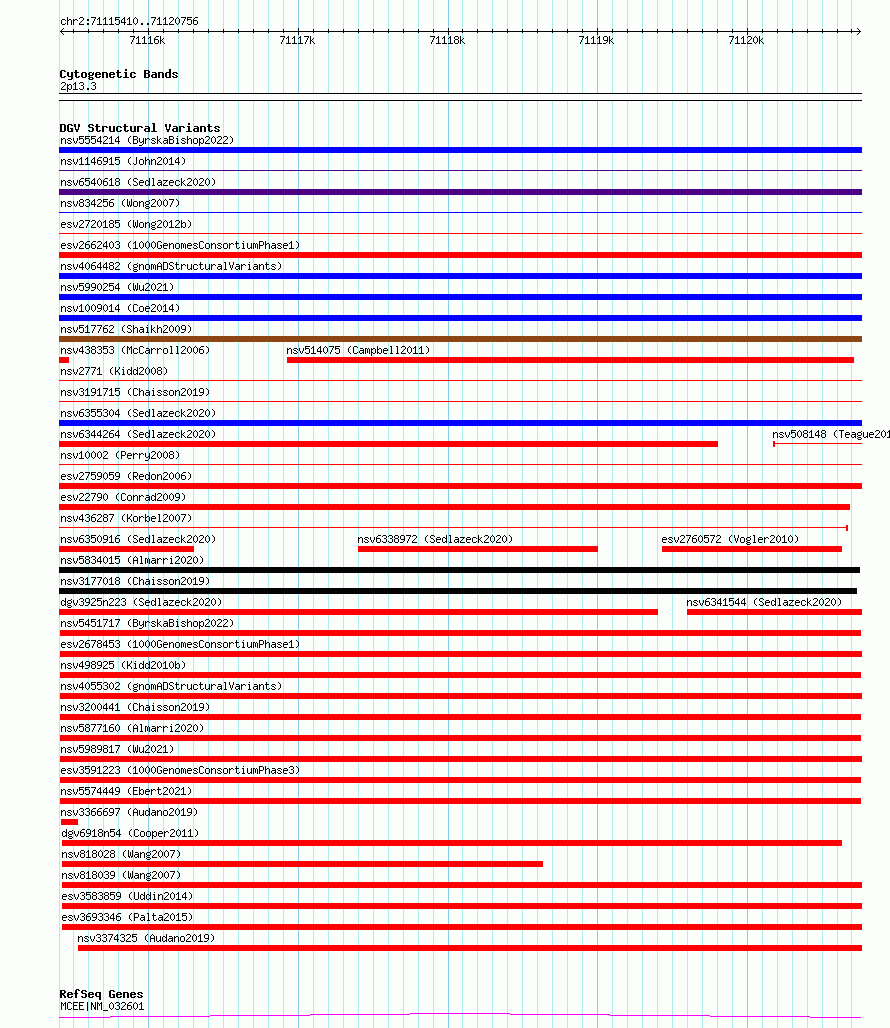 Variant DetailsVariant: esv3591223 | Internal ID | 6978551 | | Landmark | | | Location Information | | | Cytoband | 2p13.3 | | Allele length | | Assembly | Allele length | | hg38 | 5347 | | hg19 | 5347 |