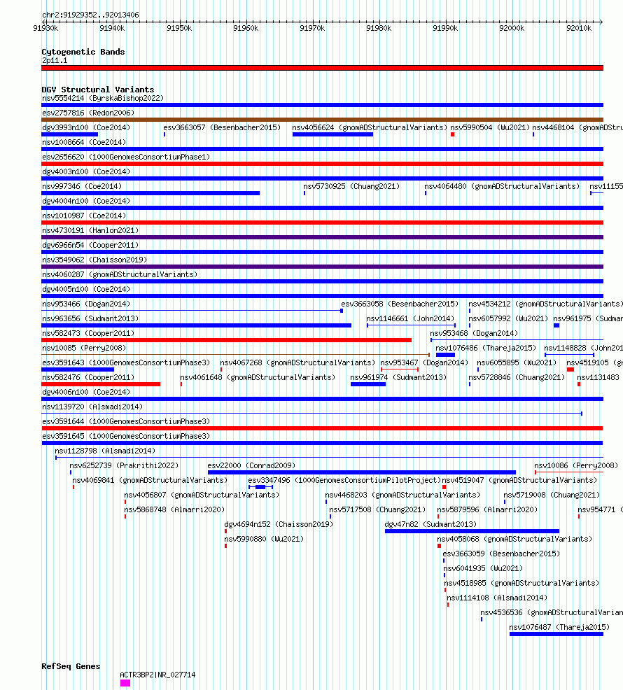 Variant DetailsVariant: esv3591645| Internal ID | 6978973 | | Landmark | | | Location Information | | | Cytoband | 2p11.1 | | Allele length | | Assembly | Allele length | | hg38 | 84055 | | hg19 | 84055 |