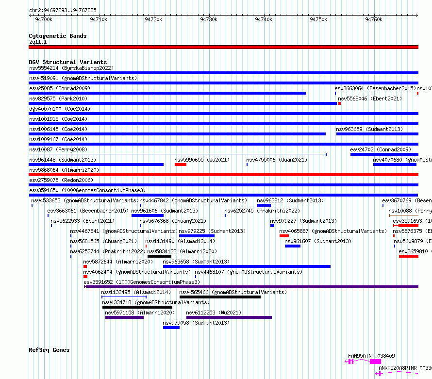 Variant DetailsVariant: esv3591650| Internal ID | 6978978 | | Landmark | | | Location Information | | | Cytoband | 2q11.1 | | Allele length | | Assembly | Allele length | | hg38 | 70593 | | hg19 | 70611 |