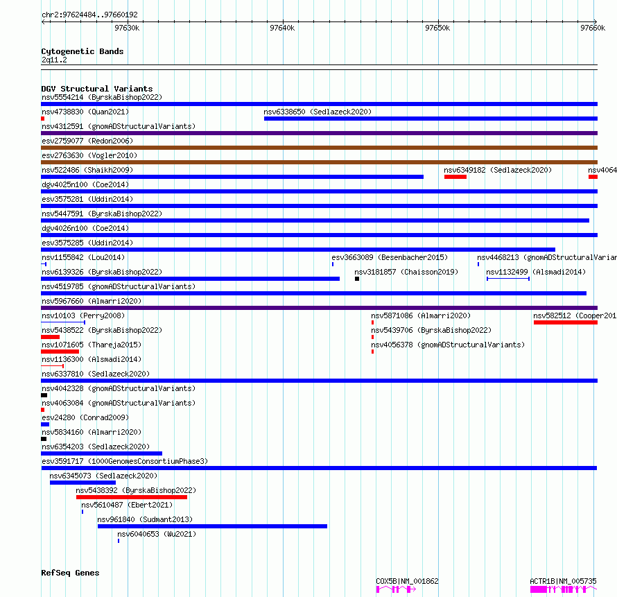 Variant DetailsVariant: esv3591717| Internal ID | 6979045 | | Landmark | | | Location Information | | | Cytoband | 2q11.2 | | Allele length | | Assembly | Allele length | | hg38 | 35709 | | hg19 | 35709 |