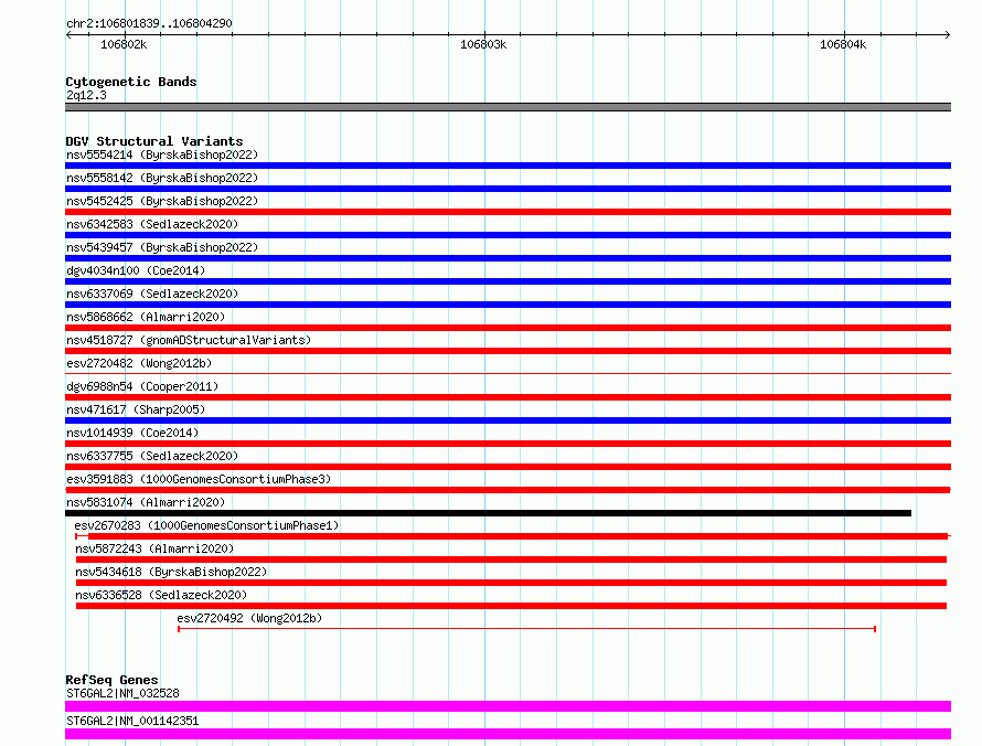 Variant DetailsVariant: esv3591883| Internal ID | 6979211 | | Landmark | | | Location Information | | | Cytoband | 2q12.2 | | Allele length | | Assembly | Allele length | | hg38 | 2452 | | hg19 | 2452 |