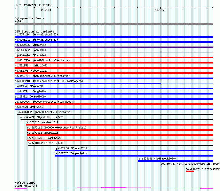 | | Variant Type | CNV loss | | Copy Number | | | Allele State | | | Allele Origin | | | Probe Count | | | Validation Flag | | | Merged Status | M | | Merged Variants | | | Supporting Variants | essv10628708, essv10628723, essv10628707, essv10628710, essv10628709, essv10628715, essv10628719, essv10628727, essv10628718, essv10628725, essv10628716, essv10628714, essv10628722, essv10628729, essv10628712, essv10628721, essv10628717, essv10628724, essv10628713, essv10628720, essv10628726, essv10628728, essv10628706, essv10628730, essv10628711 | | Samples | NA19394, HG03300, NA19377, HG03105, HG02816, NA19041, HG03045, HG03352, HG03225, NA19456, NA19445, HG03343, NA19403, HG02449, NA19327, HG03027, HG02817, HG02586, HG02613, HG02807, NA19390, NA20351, NA19121, NA19430, HG02855 | | Known Genes | ZC3H6 | | Method | Sequencing | | Analysis | | | Platform | Multiple platforms | | Comments | | | Reference | 1000_Genomes_Consortium_Phase_3 | | Pubmed ID | 21293372 | | Accession Number(s) | esv3592004