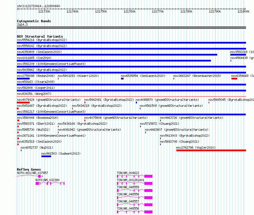 Variant DetailsVariant: esv3592217| Internal ID | 6979544 | | Landmark | | | Location Information | | | Cytoband | 2q14.3 | | Allele length | | Assembly | Allele length | | hg38 | 80227 | | hg19 | 80227 |