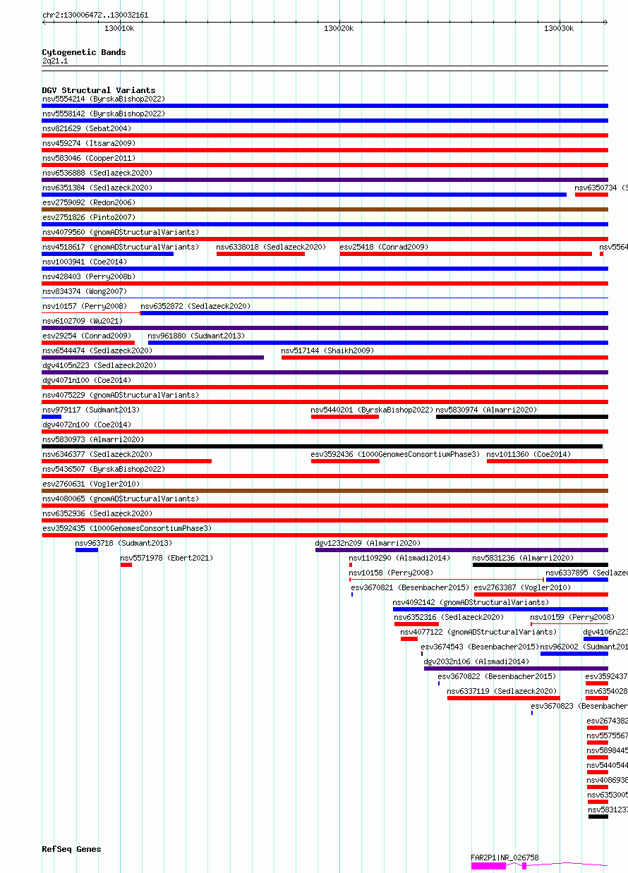 | | Variant Type | CNV loss | | Copy Number | | | Allele State | | | Allele Origin | | | Probe Count | | | Validation Flag | | | Merged Status | M | | Merged Variants | | | Supporting Variants | essv10670069, essv10670061, essv10670049, essv10670075, essv10670058, essv10670078, essv10670074, essv10670060, essv10670055, essv10670070, essv10670062, essv10670066, essv10670052, essv10670063, essv10670050, essv10670067, essv10670056, essv10670065, essv10670053, essv10670054, essv10670048, essv10670059, essv10670073, essv10670071, essv10670072, essv10670068, essv10670057, essv10670077, essv10670064, essv10670051, essv10670076 | | Samples | HG01986, HG03559, HG02318, HG03115, HG03518, NA20356, NA20287, HG02816, HG02922, HG02461, NA18908, HG02977, NA19437, HG02334, HG03085, HG02884, HG03354, HG03064, HG02813, HG02613, NA18909, HG02923, HG02314, NA19324, HG02970, HG02938, HG03410, NA19116, NA18488, HG02629, HG03271 | | Known Genes | FAR2P1 | | Method | Sequencing | | Analysis | | | Platform | Multiple platforms | | Comments | | | Reference | 1000_Genomes_Consortium_Phase_3 | | Pubmed ID | 21293372 | | Accession Number(s) | esv3592435