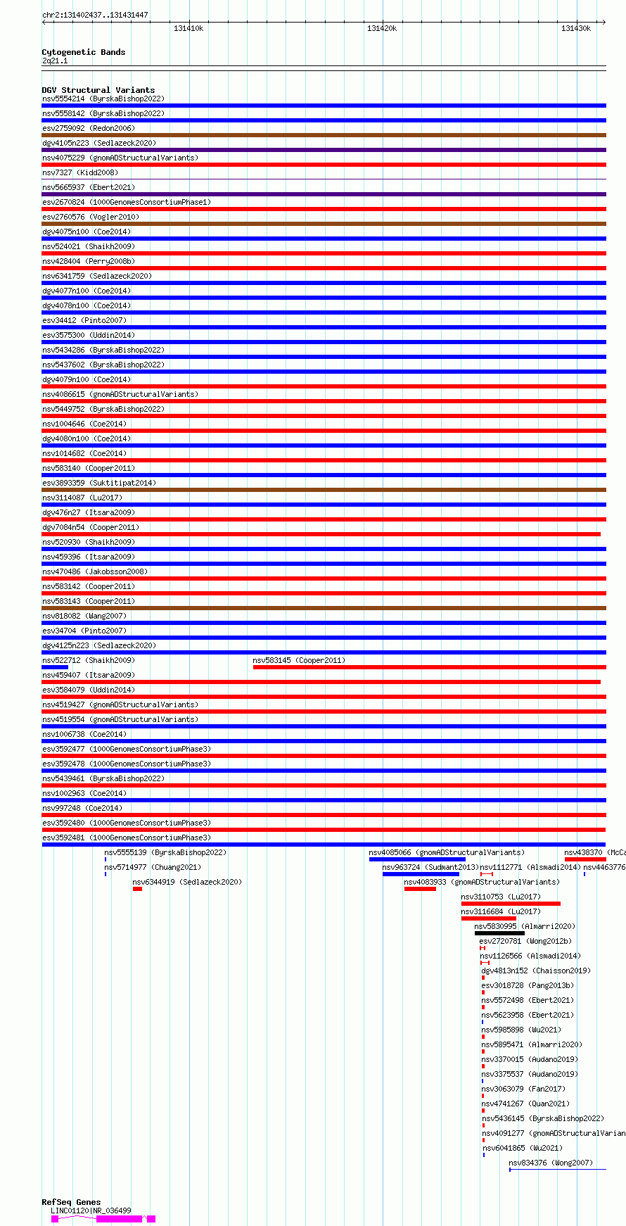 Variant DetailsVariant: esv3592480| Internal ID | 6979807 | | Landmark | | | Location Information | | | Cytoband | 2q21.1 | | Allele length | | Assembly | Allele length | | hg38 | 29011 | | hg19 | 29011 |
