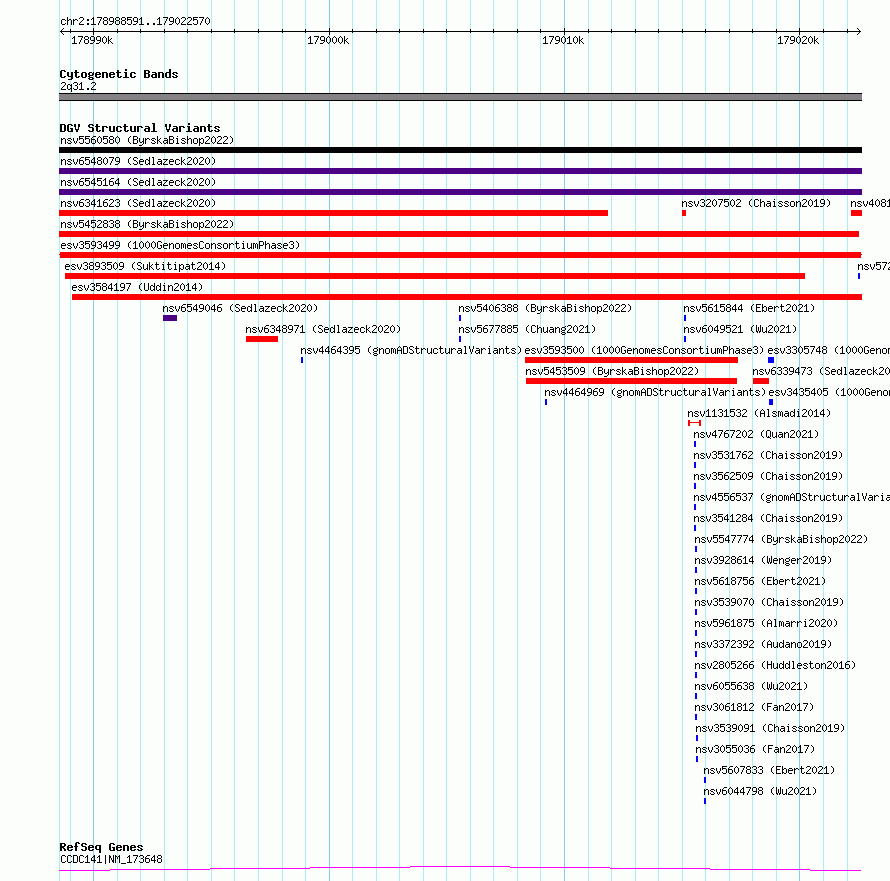 Variant DetailsVariant: esv3593499| Internal ID | 6980823 | | Landmark | | | Location Information | | | Cytoband | 2q31.2 | | Allele length | | Assembly | Allele length | | hg38 | 33980 | | hg19 | 33980 |