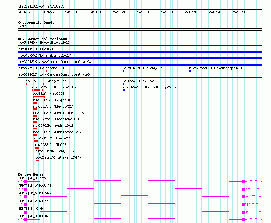 | | Variant Type | CNV gain | | Copy Number | | | Allele State | | | Allele Origin | | | Probe Count | | | Validation Flag | | | Merged Status | M | | Merged Variants | | | Supporting Variants | essv10893457, essv10893454, essv10893451, essv10893455, essv10893453, essv10893452, essv10893456 | | Samples | HG02836, HG01945, NA20862, HG01708, HG01551, HG02095, HG01431 | | Known Genes | SEPT2 | | Method | Sequencing | | Analysis | | | Platform | Multiple platforms | | Comments | | | Reference | 1000_Genomes_Consortium_Phase_3 | | Pubmed ID | 21293372 | | Accession Number(s) | esv3594827