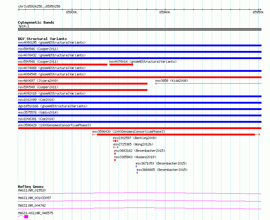 Variant DetailsVariant: esv3596429| Internal ID | 6636700 | | Landmark | | | Location Information | | | Cytoband | 3p14.1 | | Allele length | | Assembly | Allele length | | hg38 | 26001 | | hg19 | 26001 |