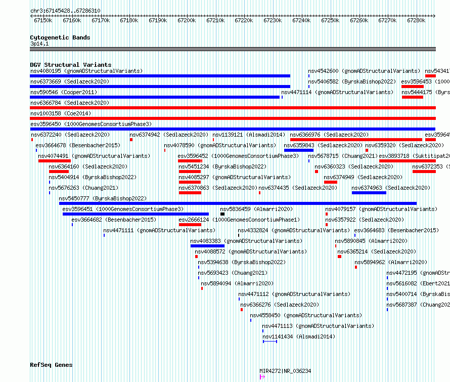 Variant DetailsVariant: esv3596450| Internal ID | 6983765 | | Landmark | | | Location Information | | | Cytoband | 3p14.1 | | Allele length | | Assembly | Allele length | | hg38 | 140883 | | hg19 | 140883 |