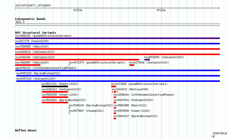Variant DetailsVariant: esv3596882| Internal ID | 6984196 | | Landmark | | | Location Information | | | Cytoband | 3p11.2 | | Allele length | | Assembly | Allele length | | hg38 | 24448 | | hg19 | 24448 |