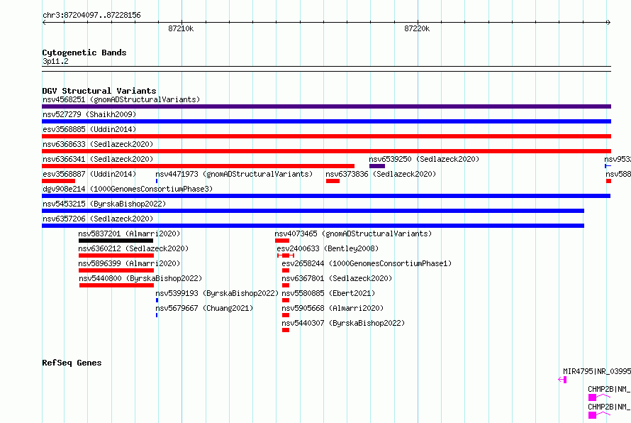 | | Variant Type | CNV gain | | Copy Number | | | Allele State | | | Allele Origin | | | Probe Count | | | Validation Flag | | | Merged Status | M | | Merged Variants | dgv908e214 | | Supporting Variants | essv11063953 | | Samples | HG00641 | | Known Genes | CHMP2B, MIR4795 | | Method | Sequencing | | Analysis | | | Platform | Multiple platforms | | Comments | | | Reference | 1000_Genomes_Consortium_Phase_3 | | Pubmed ID | 21293372 | | Accession Number(s) | esv3596883