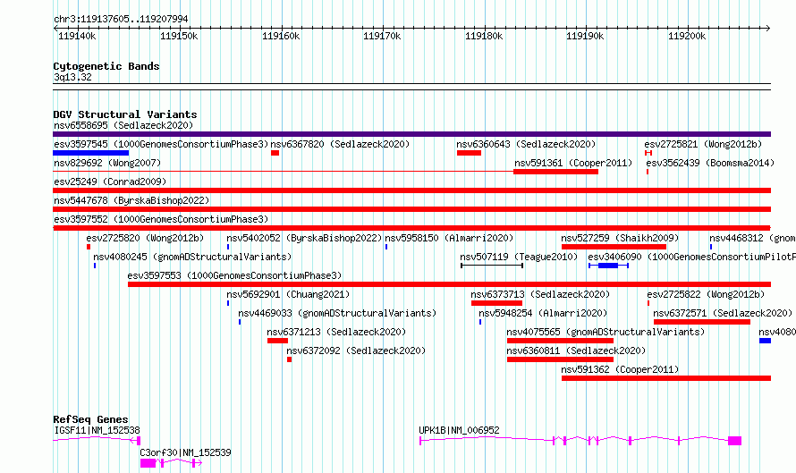 | | Variant Type | CNV loss | | Copy Number | | | Allele State | | | Allele Origin | | | Probe Count | | | Validation Flag | | | Merged Status | M | | Merged Variants | | | Supporting Variants | essv11116262 | | Samples | NA12489 | | Known Genes | C3orf30, IGSF11, UPK1B | | Method | Sequencing | | Analysis | | | Platform | Multiple platforms | | Comments | | | Reference | 1000_Genomes_Consortium_Phase_3 | | Pubmed ID | 21293372 | | Accession Number(s) | esv3597552