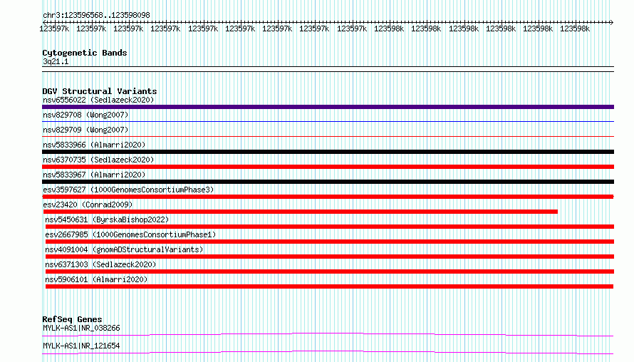 Variant DetailsVariant: esv3597627| Internal ID | 6984766 | | Landmark | | | Location Information | | | Cytoband | 3q21.1 | | Allele length | | Assembly | Allele length | | hg38 | 1531 | | hg19 | 1531 |