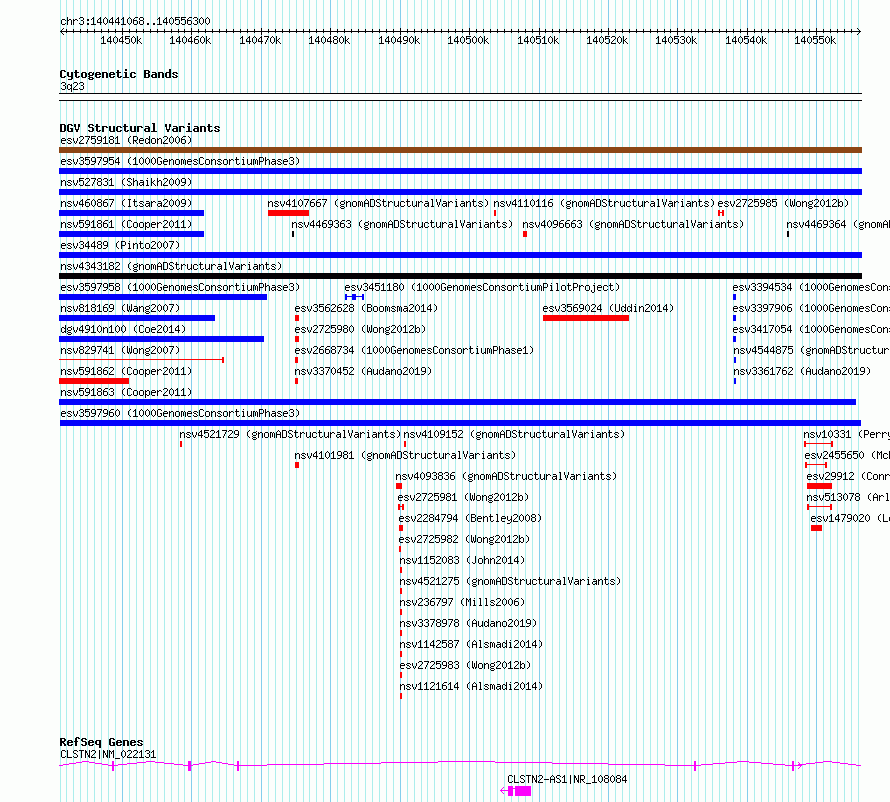 | Variant Type | CNV gain | Copy Number | | Allele State | | Allele Origin | | Probe Count | | Validation Flag | | Merged Status | M | Merged Variants | | Supporting Variants | essv11161229, essv11161228 | Samples | NA11994, HG03120 | Known Genes | CLSTN2, CLSTN2-AS1 | Method | Sequencing | Analysis | | Platform | Multiple platforms | Comments | | Reference | 1000_Genomes_Consortium_Phase_3 | Pubmed ID | 21293372 | Accession Number(s) | esv3597960