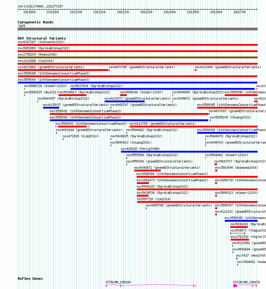 Variant DetailsVariant: esv3599089| Internal ID | 6986137 | | Landmark | | | Location Information | | | Cytoband | 3q28 | | Allele length | | Assembly | Allele length | | hg38 | 102422 | | hg19 | 102422 |