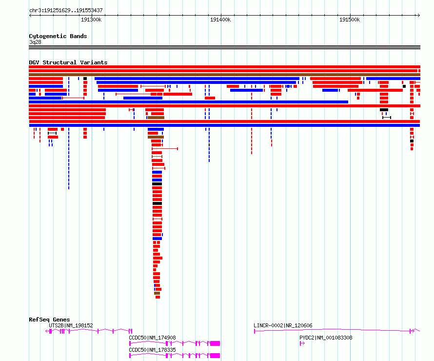 | | Variant Type | CNV loss | | Copy Number | | | Allele State | | | Allele Origin | | | Probe Count | | | Validation Flag | | | Merged Status | M | | Merged Variants | | | Supporting Variants | essv11269511 | | Samples | HG01920 | | Known Genes | CCDC50, PYDC2, UTS2B | | Method | Sequencing | | Analysis | | | Platform | Multiple platforms | | Comments | | | Reference | 1000_Genomes_Consortium_Phase_3 | | Pubmed ID | 21293372 | | Accession Number(s) | esv3599095