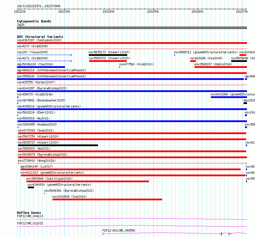 | | Variant Type | CNV loss | | Copy Number | | | Allele State | | | Allele Origin | | | Probe Count | | | Validation Flag | | | Merged Status | M | | Merged Variants | dgv966e214 | | Supporting Variants | essv11273235, essv11273233, essv11273234, essv11273232, essv11273231 | | Samples | HG00373, HG03755, HG03809, NA19010, HG03882 | | Known Genes | FGF12 | | Method | Sequencing | | Analysis | | | Platform | Multiple platforms | | Comments | | | Reference | 1000_Genomes_Consortium_Phase_3 | | Pubmed ID | 21293372 | | Accession Number(s) | esv3599141