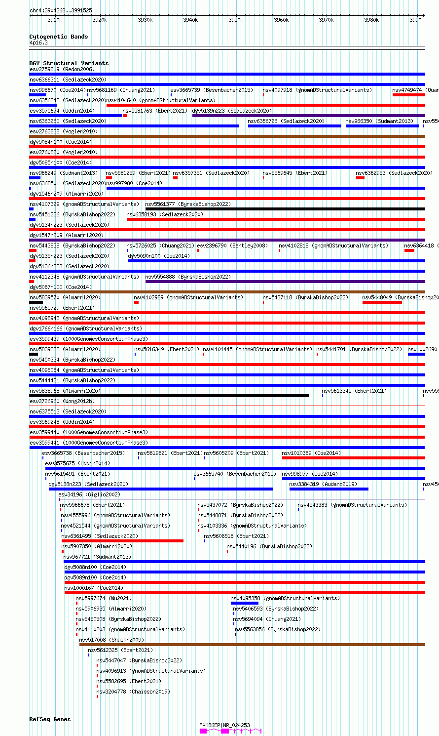 Variant DetailsVariant: esv3599440| Internal ID | 6986487 | | Landmark | | | Location Information | | | Cytoband | 4p16.3 | | Allele length | | Assembly | Allele length | | hg38 | 87158 | | hg19 | 87158 |