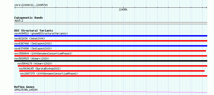 | | Variant Type | CNV loss | | Copy Number | | | Allele State | | | Allele Origin | | | Probe Count | | | Validation Flag | | | Merged Status | M | | Merged Variants | | | Supporting Variants | essv11370093, essv11370112, essv11370091, essv11370097, essv11370088, essv11370083, essv11370113, essv11370111, essv11370115, essv11370105, essv11370109, essv11370106, essv11370114, essv11370100, essv11370096, essv11370080, essv11370098, essv11370095, essv11370110, essv11370092, essv11370084, essv11370082, essv11370081, essv11370087, essv11370089, essv11370108, essv11370090, essv11370085, essv11370102, essv11370094, essv11370086, essv11370107, essv11370099, essv11370101, essv11370104, essv11370103 | | Samples | HG01986, NA19701, NA19909, HG03130, NA19092, HG03280, NA18878, HG02888, NA19190, HG03578, HG01365, NA20287, HG02981, HG03520, HG03189, HG02946, HG03270, HG02442, HG03132, HG03511, NA18516, HG02497, HG02555, NA19118, HG03136, NA19031, NA19338, HG02979, HG03046, NA18523, NA19108, NA18517, HG02941, HG03157, NA19116, HG03303 | | Known Genes | GPR125 | | Method | Sequencing | | Analysis | | | Platform | Multiple platforms | | Comments | | | Reference | 1000_Genomes_Consortium_Phase_3 | | Pubmed ID | 21293372 | | Accession Number(s) | esv3599904