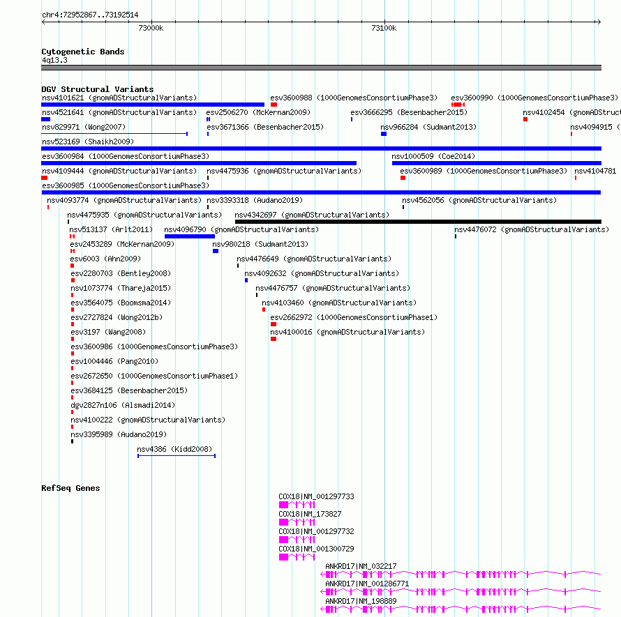 | | Variant Type | CNV gain | | Copy Number | | | Allele State | | | Allele Origin | | | Probe Count | | | Validation Flag | | | Merged Status | M | | Merged Variants | | | Supporting Variants | essv11497820 | | Samples | HG02699 | | Known Genes | ANKRD17, COX18 | | Method | Sequencing | | Analysis | | | Platform | Multiple platforms | | Comments | | | Reference | 1000_Genomes_Consortium_Phase_3 | | Pubmed ID | 21293372 | | Accession Number(s) | esv3600985