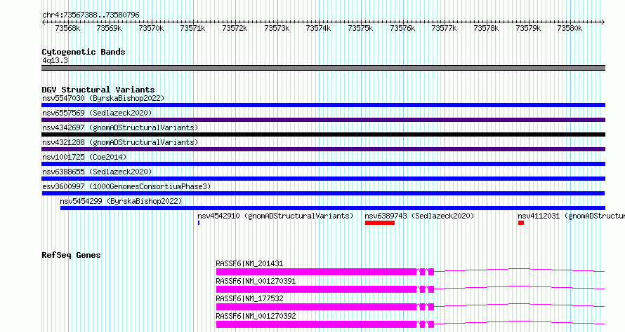 Variant DetailsVariant: esv3600997| Internal ID | 6988036 | | Landmark | | | Location Information | | | Cytoband | 4q13.3 | | Allele length | | Assembly | Allele length | | hg38 | 13409 | | hg19 | 13409 |