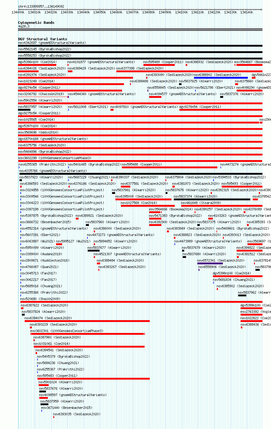Variant DetailsVariant: esv3602299| Internal ID | 6989333 | | Landmark | | | Location Information | | | Cytoband | 4q28.3 | | Allele length | | Assembly | Allele length | | hg38 | 149136 | | hg19 | 149136 |