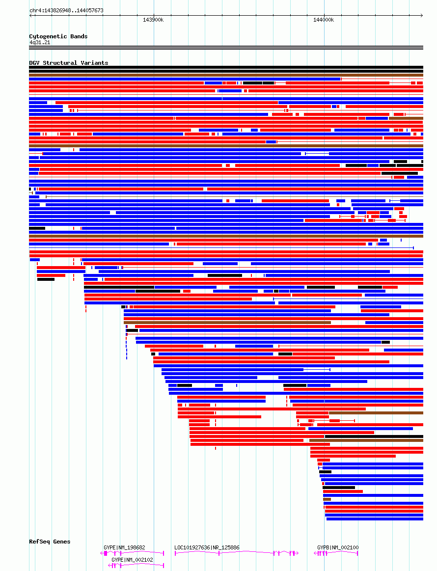 Variant DetailsVariant: esv3602516| Internal ID | 6989550 | | Landmark | | | Location Information | | | Cytoband | 4q31.21 | | Allele length | | Assembly | Allele length | | hg38 | 230726 | | hg19 | 230726 |