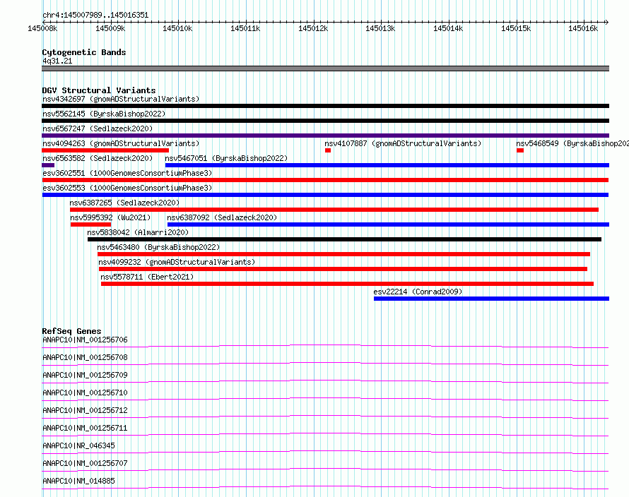 | | Variant Type | CNV gain | | Copy Number | | | Allele State | | | Allele Origin | | | Probe Count | | | Validation Flag | | | Merged Status | M | | Merged Variants | | | Supporting Variants | essv11641055, essv11641056 | | Samples | HG02165, NA18946 | | Known Genes | ANAPC10 | | Method | Sequencing | | Analysis | | | Platform | Multiple platforms | | Comments | | | Reference | 1000_Genomes_Consortium_Phase_3 | | Pubmed ID | 21293372 | | Accession Number(s) | esv3602553