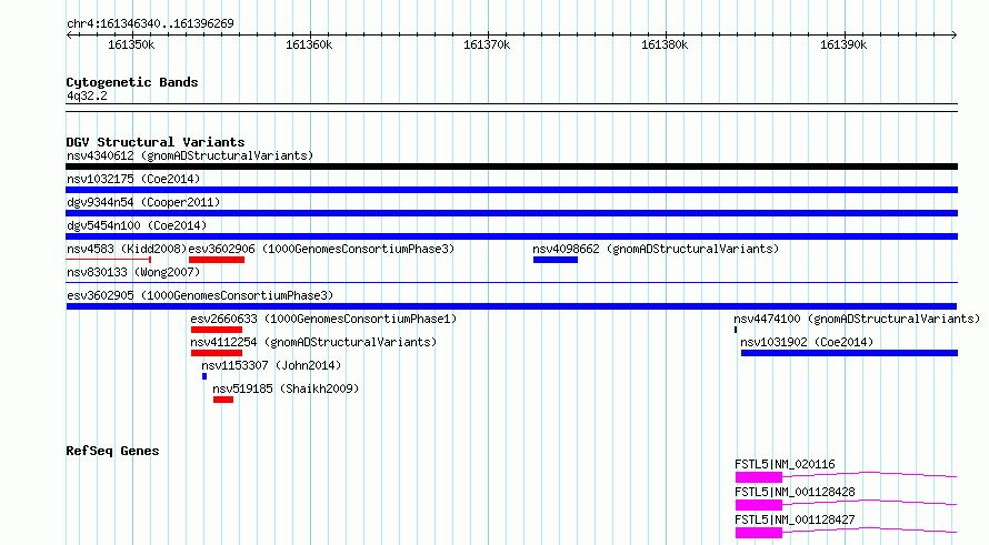 Variant DetailsVariant: esv3602905| Internal ID | 6643161 | | Landmark | | | Location Information | | | Cytoband | 4q32.2 | | Allele length | | Assembly | Allele length | | hg38 | 49930 | | hg19 | 49930 |