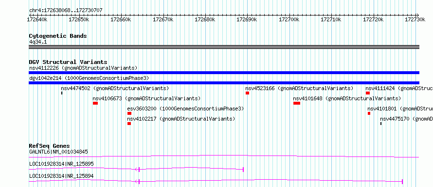 | | Variant Type | CNV gain | | Copy Number | | | Allele State | | | Allele Origin | | | Probe Count | | | Validation Flag | | | Merged Status | M | | Merged Variants | dgv1042e214 | | Supporting Variants | essv11705021, essv11705022 | | Samples | HG02064, HG01804 | | Known Genes | GALNTL6 | | Method | Sequencing | | Analysis | | | Platform | Multiple platforms | | Comments | | | Reference | 1000_Genomes_Consortium_Phase_3 | | Pubmed ID | 21293372 | | Accession Number(s) | esv3603199