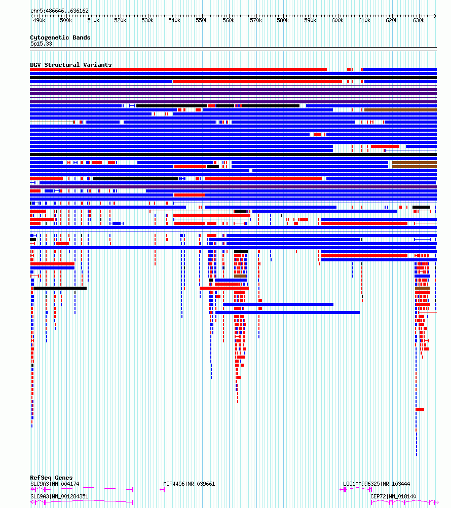 Variant DetailsVariant: esv3603750| Internal ID | 6990781 | | Landmark | | | Location Information | | | Cytoband | 5p15.33 | | Allele length | | Assembly | Allele length | | hg38 | 149517 | | hg19 | 149517 |