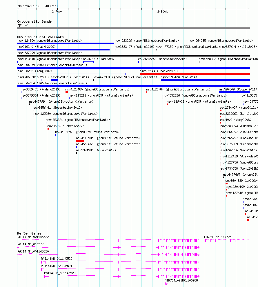 | Variant Type | CNV gain | Copy Number | | Allele State | | Allele Origin | | Probe Count | | Validation Flag | | Merged Status | M | Merged Variants | | Supporting Variants | essv11865960 | Samples | NA12717 | Known Genes | RAI14, TTC23L | Method | Sequencing | Analysis | | Platform | Multiple platforms | Comments | | Reference | 1000_Genomes_Consortium_Phase_3 | Pubmed ID | 21293372 | Accession Number(s) | esv3604684