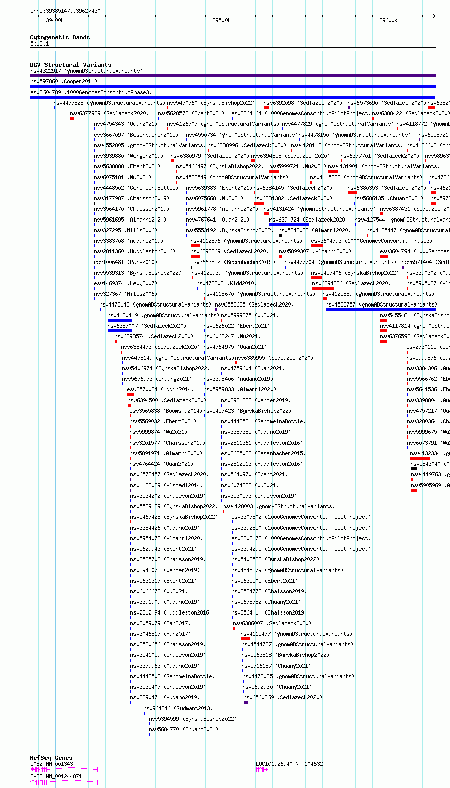 Variant DetailsVariant: esv3604789| Internal ID | 6991817 | | Landmark | | | Location Information | | | Cytoband | 5p13.1 | | Allele length | | Assembly | Allele length | | hg38 | 242284 | | hg19 | 242284 |