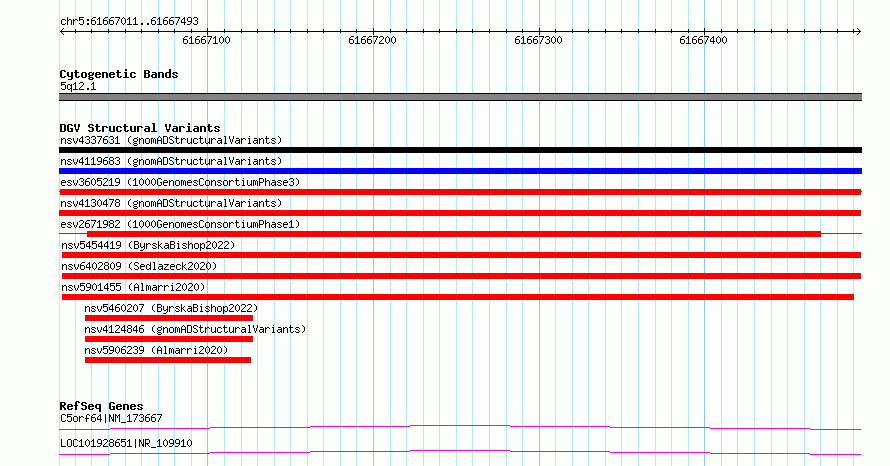Variant DetailsVariant: esv3605219| Internal ID | 6992245 | | Landmark | | | Location Information | | | Cytoband | 5q12.1 | | Allele length | | Assembly | Allele length | | hg38 | 483 | | hg19 | 483 |